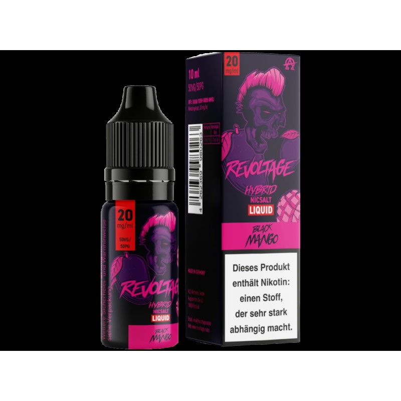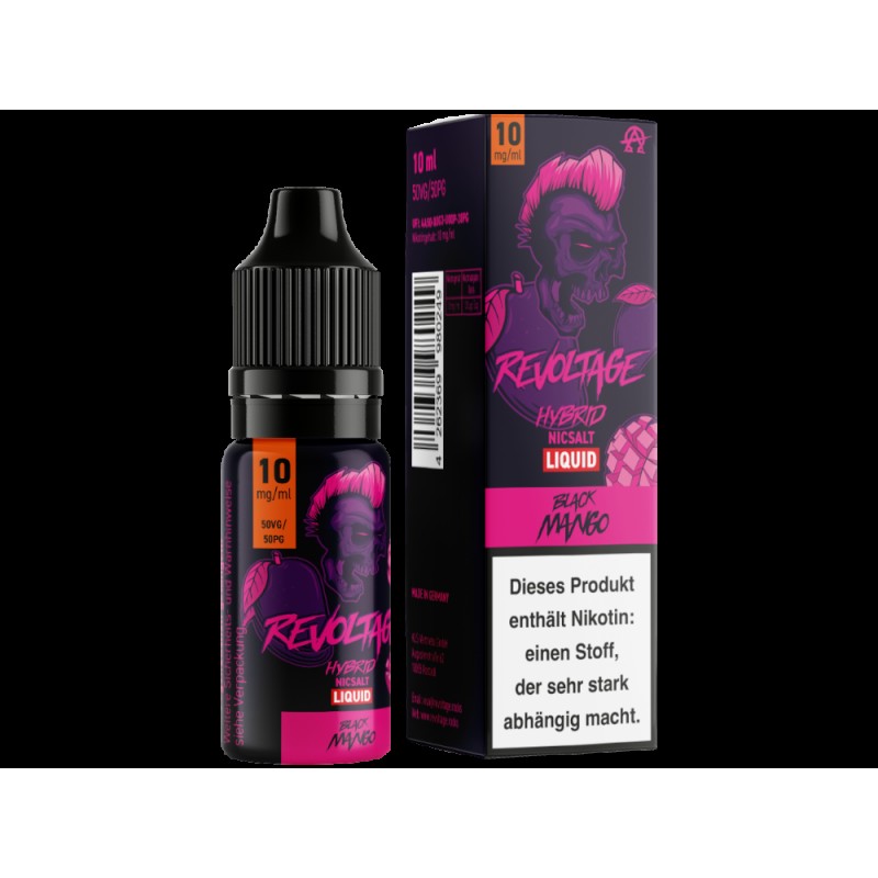 Das Black Mango Hybrid Nikotinsalz ist ein Liquid der Marke Revoltage. In Kombination mit Ihrer E-Zigarette schmeckt das Liquid nach Mango mit einer frischen Note. Das Hybrid Nikotinsalz befindet sich mit 10 ml vorgefüllt in einer 10 ml Liquidflasche. Das Liquid können Sie in den Nikotinstärken 10 mg/ml und 20 mg/ml erwerben.