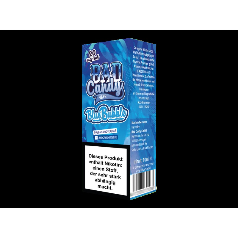 Mit dem Liquid Blue Bubble aus dem Hause Bad Candy Liquids erhalten Sie ein Nikotinsalz Liquid, welches zum puren Dampfen geeignet ist. Beim Vapen entwickelt es den Geschmack von Blaubeeren, Johannisbeeren, Limonade und Kaugummi. Erhältlich ist das Nikotinsalz Liquid in den Stärken 10 mg/ml und 20 mg/ml. Pro bestellter Einheit erhalten Sie eine 10 ml Flasche mit 10 ml Inhalt.Auszeichnung gemäß CLP-Verordnung (EG) Nr. 1272/2008