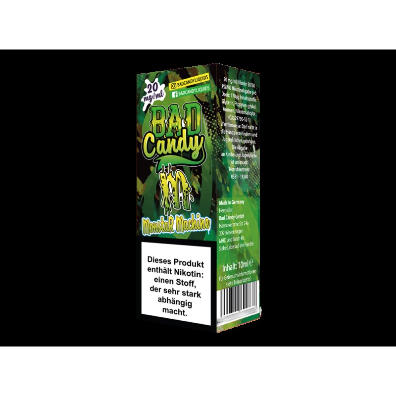 Mit dem Liquid Monstar Machine aus dem Hause Bad Candy Liquids erhalten Sie ein Nikotinsalz Liquid, welches zum puren Dampfen geeignet ist. Beim Vapen entwickelt es den Geschmack eines Energy Drinks mit frischer Note. Erhältlich ist das Nikotinsalz Liquid in den Stärken 10 mg/ml und 20 mg/ml. Pro bestellter Einheit erhalten Sie eine 10 ml Flasche mit 10 ml Inhalt.Auszeichnung gemäß CLP-Verordnung (EG) Nr. 1272/2008