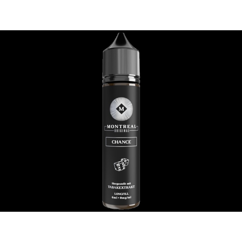 Das Montreal Original Chance ist ein Longfill-Aroma, das 6 ml Konzentrat in einer 60 ml Flasche enthält. Geschmacklich wird es als amerikanischer, gerösteter Tabak mit einer kräftig-nussigen Charakteristik beschrieben. Die Herstellung erfolgt durch Extraktion aus industriellen Tabakmischungen, mit der Absicht, einen Geschmack zu erzielen, der an bekannte Zigarettenmarken erinnern soll und sich von reinem Tabakblatt-Aroma unterscheidet. Das resultierende Geschmackserlebnis wird als weich und ohne langanhaltenden Nachgeschmack angegeben. Hinweis: Aufgrund der hohen Konzentration muss das Aroma vor dem Dampfen verdünnt werden und ist nicht zur unverdünnten Anwendung geeignetAuszeichnung gemäß CLP-Verordnung (EG) Nr. 1272/2008
