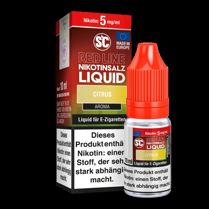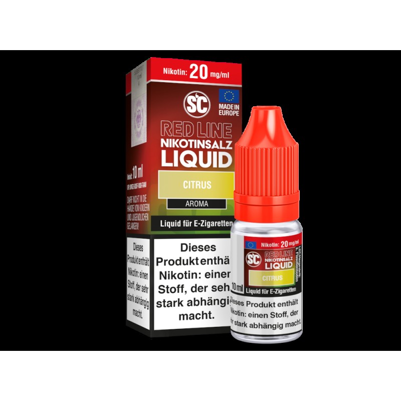 Alle Liquids der SC Red Line Serie bestehen aus überdosierten Geschmäckern, die Sie schon aus Einweg E-Zigaretten kennen. Daher entfalten die SC Red Line Nikotinsalz Liquids im niedrigen Leistungsbereich mehr Aroma als herkömmliche Liquids.Mit dem Nikotinsalz Liquid Citrus aus der Serie Red Line von SC erhalten Sie ein Liquid, welches beim Dampfen den intensiven Geschmack von Zitrusfrüchten und einer frischen Note freisetzt. Die Red Line Nikotinsalz Liquids sind gebrauchsfertige Liquids und daher für den direkten Gebrauch in Ihrer E-Zigarette geeignet. Die Red Line Nikotinsalz Liquids erhalten Sie wahlweise in den Stärken mit 0 mg/ml, 5 mg/ml, 10 mg/ml und 20 mg/ml.