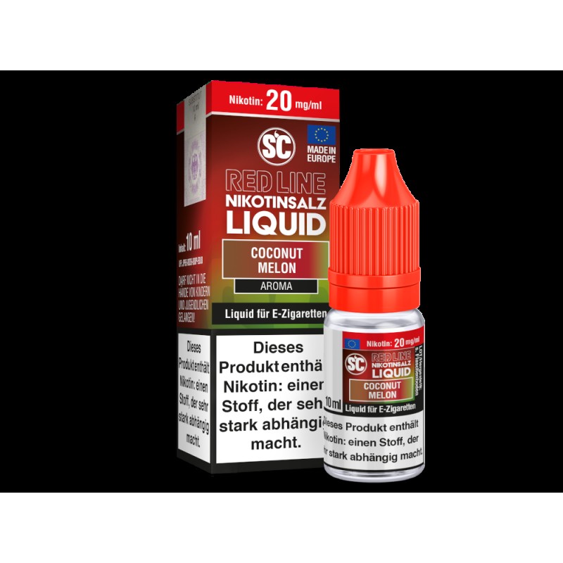 Alle Liquids der SC Red Line Serie bestehen aus überdosierten Geschmäckern, die Sie schon aus Einweg E-Zigaretten kennen. Daher entfalten die SC Red Line Nikotinsalz Liquids im niedrigen Leistungsbereich mehr Aroma als herkömmliche Liquids.Mit dem Nikotinsalz Liquid Coconut Melon aus der Serie Red Line von SC erhalten Sie ein Liquid, welches beim Dampfen den intensiven Geschmack von Kokosnuss und Wassermelone mit einer frischen Note freisetzt. Die Red Line Nikotinsalz Liquids sind gebrauchsfertige Liquids und daher für den direkten Gebrauch in Ihrer E-Zigarette geeignet. Die Red Line Nikotinsalz Liquids erhalten Sie wahlweise in den Stärken mit 0 mg/ml, 5 mg/ml, 10 mg/ml und 20 mg/ml.